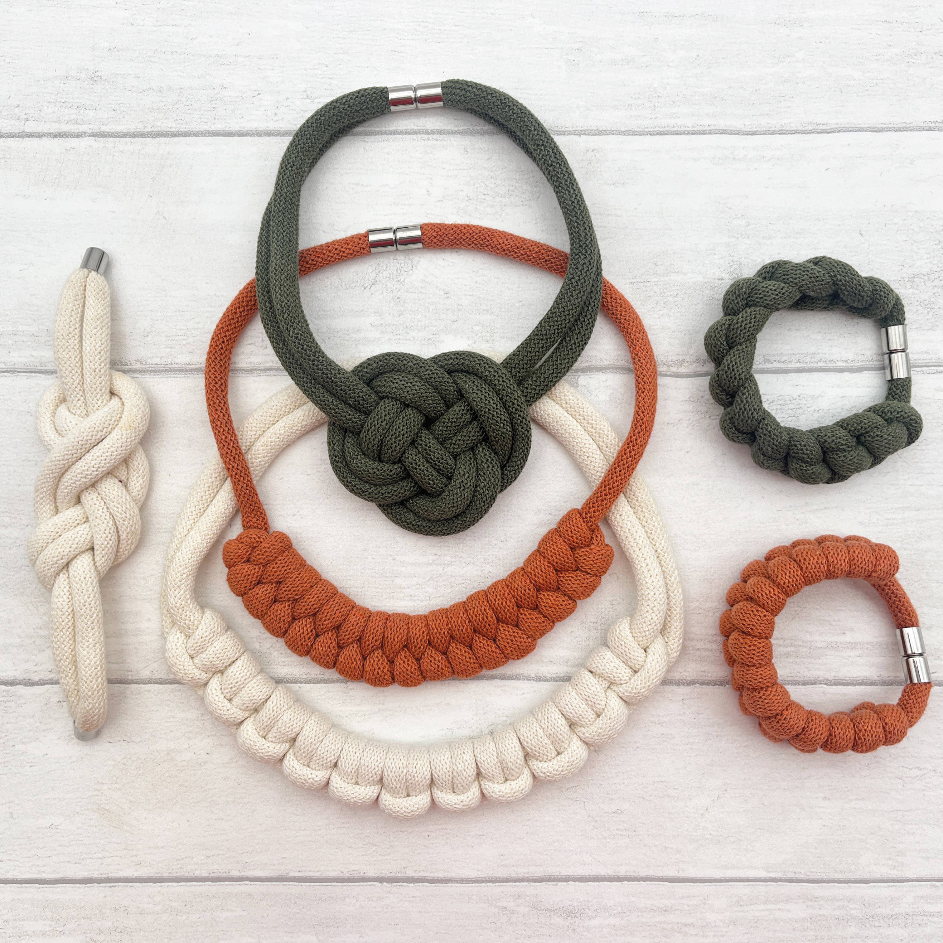The finished jewellery designs are so striking and unique. Inside the box, you will find 14 metres of beautiful braided, recycled cotton cord in warm terracotta, avocado green and natural white. Plus six magnetic metal clasps and photographic step-by-step instruction cards.